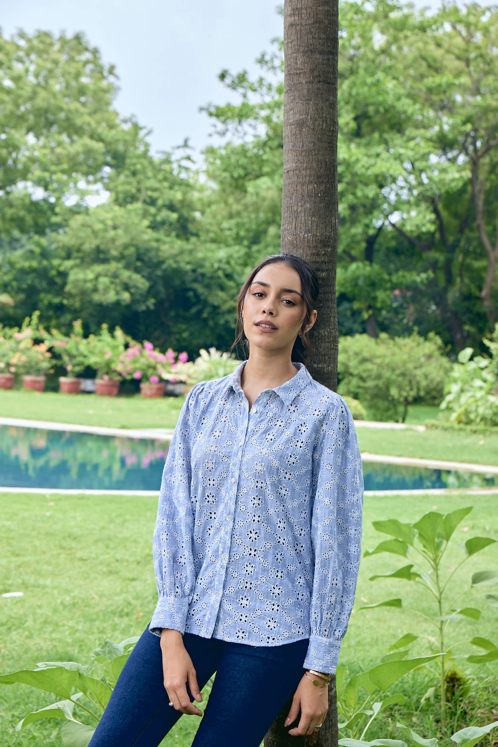 Introducing the Amanda Shirt—a timeless and versatile classic. This light grey shirt is adorned with beautiful schiffli embroidery all over, exuding an elegant charm. With its bishop sleeves and relaxed fit, it offers both comfort and a graceful silhouette. The Amanda Shirt is a versatile addition to any wardrobe, effortlessly transitioning from casual to formal occasions. Its combination of exquisite details and a classic design makes it a must-have piece for effortless style.