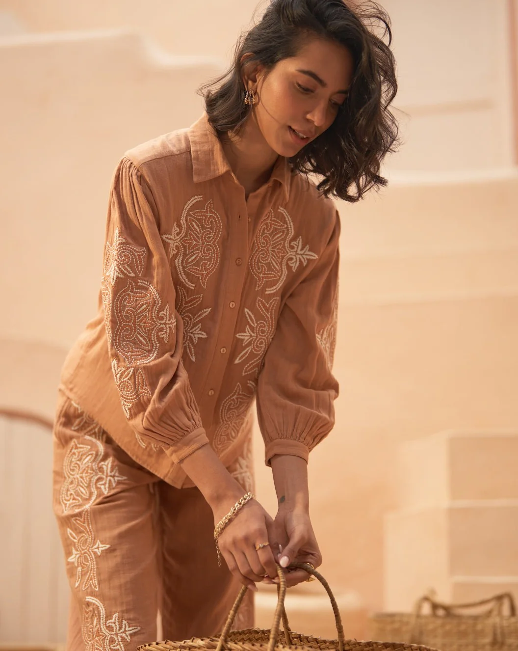 This shirt exudes a relaxed vibe with exquisite embroidery adorning the sleeves and body. It features collars and bishop sleeves for a refined and airy aesthetic. Pair it effortlessly with the matching pant for a coordinated look, perfect for any summer occasion.