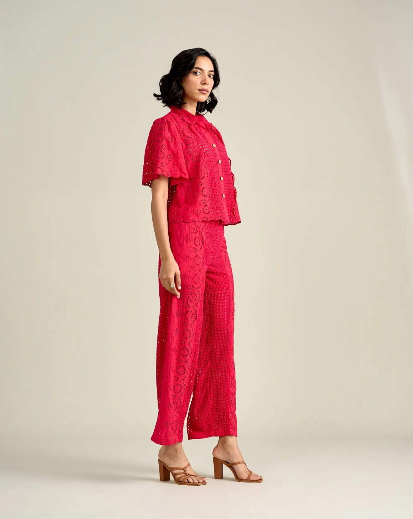 Embrace vibrant style with the Elsa Schiffli Top Made from red schiffli fabric, this shirt exudes playful charm. Its intricate schiffli embroidery adds an artistic touch, while the relaxed fit ensures comfort on casual days. Paired with the coordinating pants, this shirt creates a stunning co-ord set that effortlessly combines style and comfort. Embrace the carefree spirit of summer with the Elsa Schiffli Top and make a bold statement wherever you go.